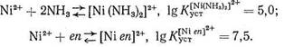 В обоих комплексах ион Ni2+ координирует два атома азота. Большая величина Kуст в случае этилендиаминового комплекса, несомненно, связана с хелатным эффектом: в комплексе [Niеn]2+ имеется пятичленный хелатный цикл, тогда как у комплекса [Ni (NH3)2]2+ — «открытое» строение: