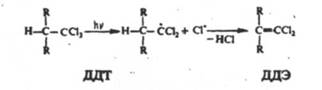 Попавшие в природную среду пестициды могут разрушаться как абиотическим, так и биотическим путем. В первом случае превращение осуществляется за счет фотохимических реакций, окислительно-восстановительных реакций и гидролиза. При биотических ( под действием ферментов) превращениях особое значение имеют реакции окисления, восстановления, гидролиза, разрыва углеродных цепей. В фотохимическом окислении особо важную роль играют реакции под действием обладающих большой энергией УФ-лучей. При поглощения веществом УФ-излучения часто происходят гомолитическое расщепление связи С-С1, которое сопровождается другими рекциями. Образующиеся при этом радикалы могут дальше взаимодействовать с галогенами, водой или другими донорами протонов, как это видно на примере ДДТ: