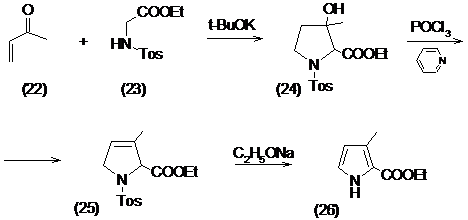 Присоединение по Михаэлю эфира N-тозилглицина (23) к кетону (22) в присутствии третбутилата калия с последующей внутримолекулярной альдольной конденсацией приводит к образованию гидроксипирролидина (24), при дегидрогалогенировании которого образуется Δ3-пирролин (25); отщепление от него п-толуолсульфиновой кислоты под действием этилата натрия приводит к пирролу (26) с удовлетворительным выходом ~ 30-40% [16].