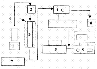 1 — баллон со сжатым газом-носителем; 2 — вентиль; 3 — регулятор и измеритель скорости газа-носителя; 4 — дозатор; ,5 — проба; 6 — хроматографическая колонка; 7 — детектор; 8 — выход газа; 9 — питание детектора; 10 — преобразователь сигналов; 11 — ленточный самописец; 12 — терморегулятор; 13 — термостат.