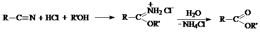 Действие на нитрилы хлороводорода в спирте приводит к образованию гидрохлоридов иминоэфиров, дальнейший гидролиз которых дает эфиры: